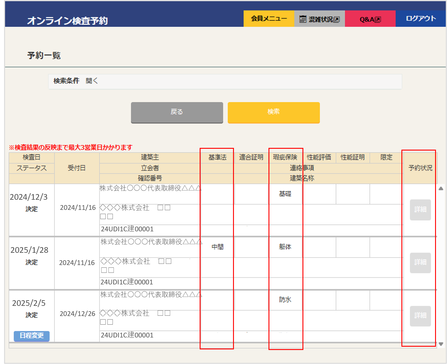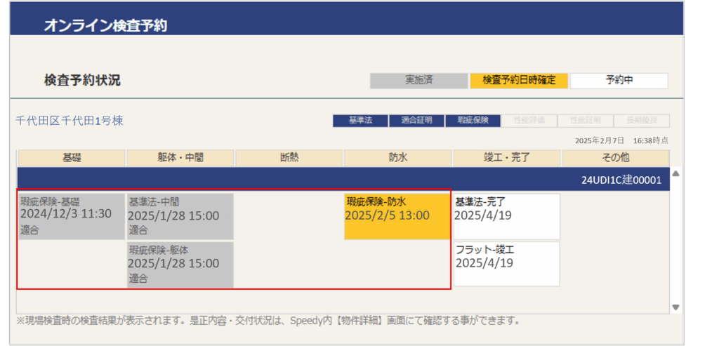ex.完了時の申請を請け負っているんだけど、躯体検査はいつ受けたのかな?など、ご自身が予約した物件の、別の方が予約された検査も含めて全行程の検査実施状況を確認することができます。
